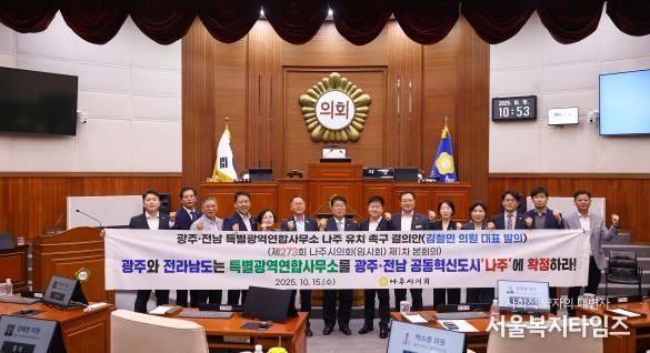 서울복지타임즈 이재연 기자 | 나주시의회는 15일 제273회 임시회 제1차 본회의를 열고 ‘광주·전남 특별광역연합사무소 나주 유치 촉구 결의안’을 채택했다.