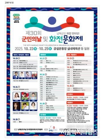 서울복지타임즈 이재연 기자 | 남해군민의날추진위원회는 오는 10월 23일부터 25일까지 3일간 남해공설운동장과 실내체육관 일원에서 ‘제30회 군민의 날 및 화전문화제’를 개최한다.