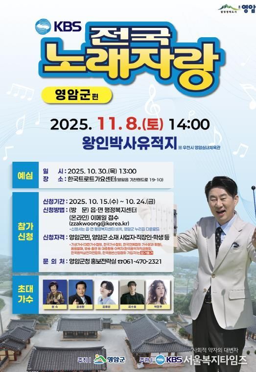 영암군 주최, KBS 주관으로 11/8일 오후 2시 왕인박사유적지에서 열리는 전국노래자랑에서 솜씨를 뽐낼 영암군민 등의 신청을 받는다.