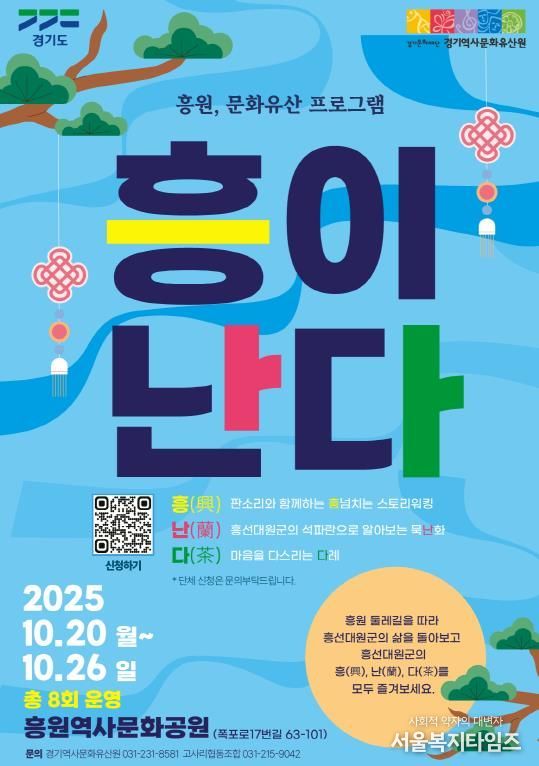 서울복지타임즈 이재연 기자 | 경기도와 경기문화재단(경기역사문화유산원)은 오는 10월 20일부터 26일까지 흥선대원군의 묘소인 흥원(남양주시 화도읍 폭포로17번길 63-101)에서 문화유산 프로그램 ‘흥이난다’를 개최한다.