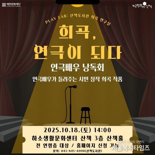서울복지타임즈 이재연 기자 | 제천문화재단(이사장 김상수)이'2025년 문학상주작가 지원사업'의 일환으로 상주작가와 마지막 문학프로그램인 '희곡, 연극이 되다' 연극배우 낭독회를 오는 18일 하소생활문화센터 산책에서 선보인다.