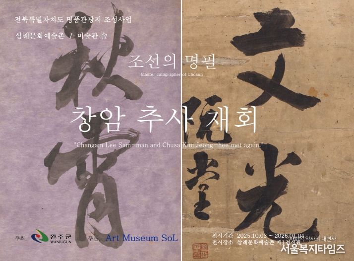 서울복지타임즈 이재연 기자 | 완주군이 삼례문화예술촌 제1전시관에서 조선시대를 대표하는 명필 두 인물, 창암 이삼만(蒼巖 李三晩, 1770~1847)과 추사 김정희(秋史 金正喜, 1786~1856)의 예술세계를 한자리에서 만날 수 있는 특별전 ‘창암 추사 재회’가 성황리에 열리고 있다.