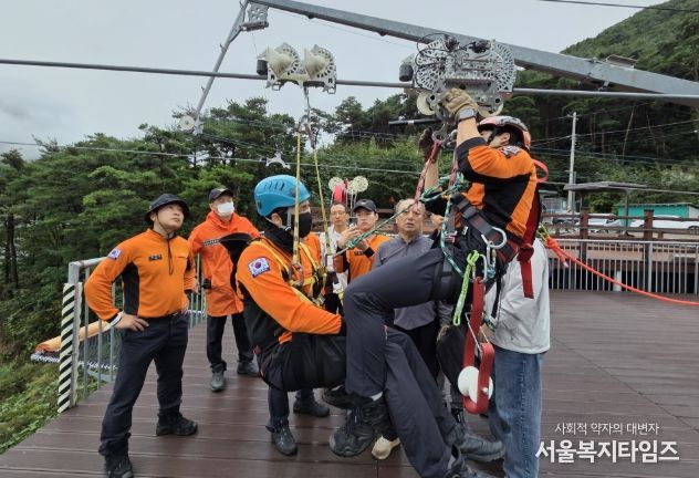서울복지타임즈 이재연 기자 | 영천시시설관리공단은 지난 14일 보현산댐 짚와이어에서 영천소방서 구조대와 합동으로 구조 훈련을 실시했다.