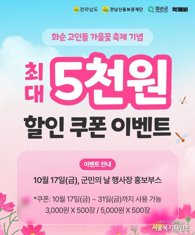 서울복지타임즈 이재연 기자 | 화순군은 오는 10월 17일 제44회 화순군민의 날 행사장에서 2025 화순 고인돌 가을꽃 축제 기념 공공배달앱 ‘먹깨비’ 이벤트를 진행한다고 밝혔다.