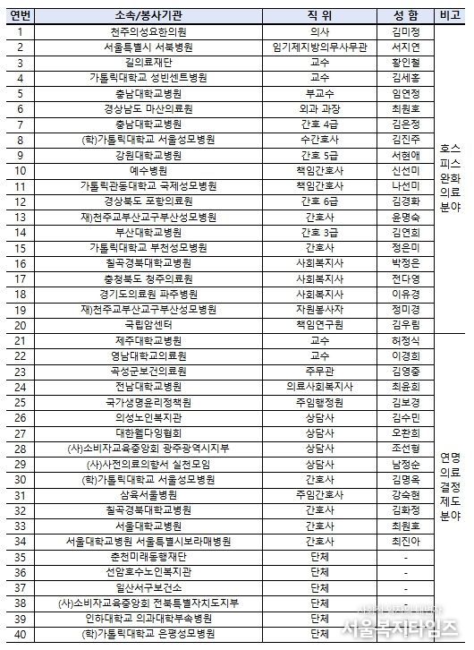 호스피스·완화의료 분야에서는 호스피스·완화의료 연구 발전에 이바지한 가천대 길병원 황인철 교수, 가톨릭대학교 서울성모병원 김진주 간호사, 천주교부산교구부산성모병원 정미경 자원봉사자 등 총 20명에 대해서 장관 표창을 수여했다.