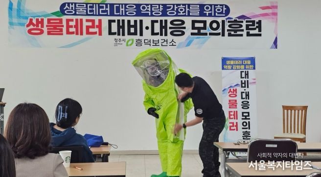 서울복지타임즈 이재연 기자 | 청주시 흥덕보건소는 16일 생물테러 발생 시 신속하고 체계적인 초등 대응 능력을 강화하기 위해, 보건소에서 대비·대응 소규모 모의훈련을 실시했다.