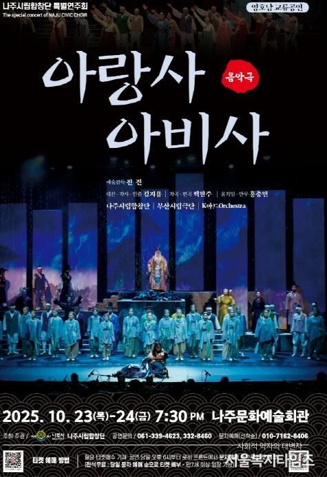 이번 공연은 나주 지역 설화인 ‘앙암바위 전설, 아랑사 아비사’를 바탕으로 한 창작음악극으로 나주의 역사와 정체성을 예술로 풀어낸 대표적인 지역 문화공연이다.
