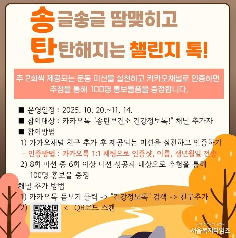 서울복지타임즈 이재연 기자 | 평택시 송탄보건소는 10월 20일부터 11월 14일까지 카카오톡을 활용한 ‘(송)글송글 땀 맺히고 (탄)탄해지는 챌린지 톡!’을 운영할 예정이라고 밝혔다.