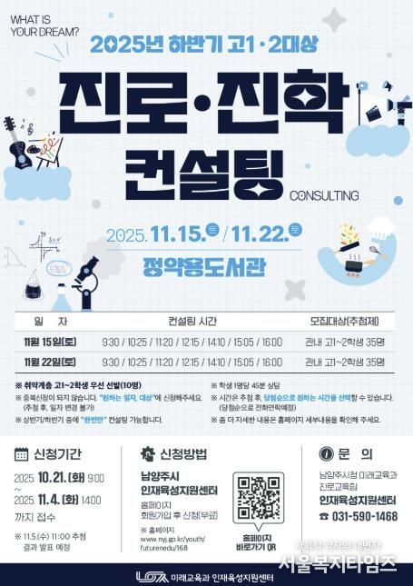 서울복지타임즈 이재연 기자 | 남양주시는 오는 21일부터 ‘2025년 하반기 진로·진학 컨설팅’참가자를 모집한다고 밝혔다.