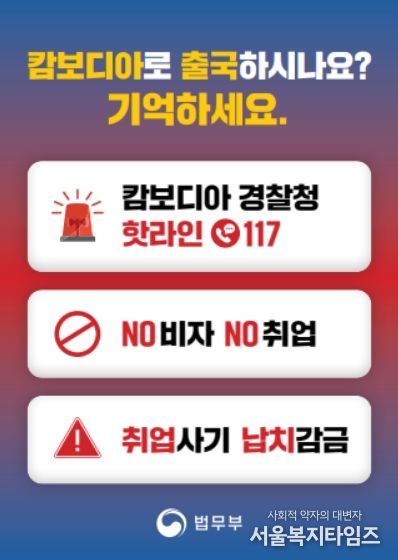 서울복지타임즈 이재연 기자 | 법무부는 우리 국민이 캄보디아 현지에서 취업사기 등으로 피해를 입는 사례가 지속적으로 발생함에 따라, 10월 17일부터 인천공항에서 캄보디아로 출국하는 국민이 출국 초기 단계에서부터 관련 위험을 인지할 수 있도록 안내하는 조치를 시행했다고 밝혔다.