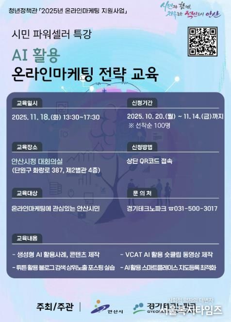서울복지타임즈 이재연 기자 | 안산시는 다음 달 14일까지 생성형 인공지능(AI)을 활용한 온라인 마케팅 역량 강화 ‘시민 파워셀러’ 6회차 교육생을 모집한다고 20일 밝혔다.