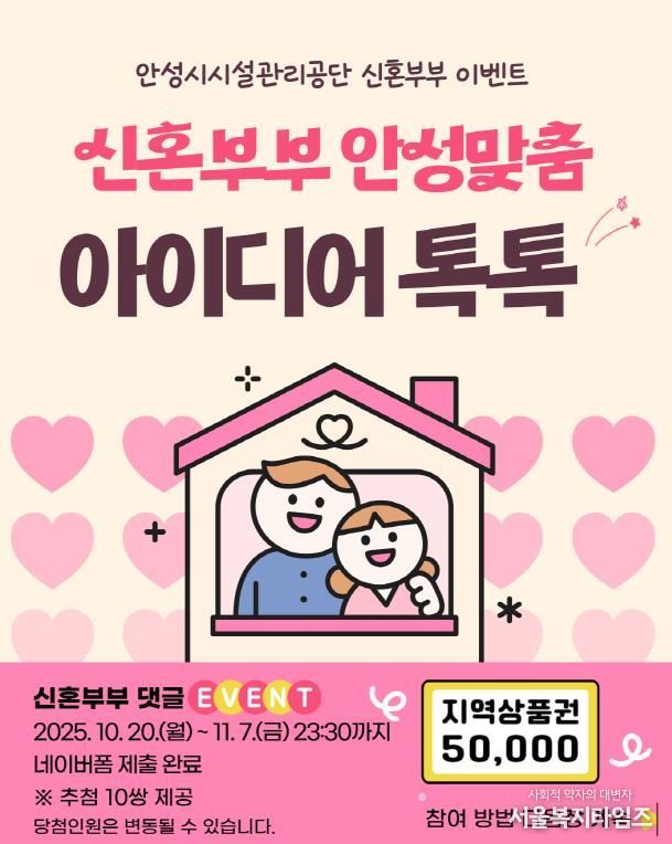 댓글 주제는 △공단에 있었으면 하는 시설·프로그램 제안 △신혼부부로서 공단 시설 이용 시 개선이 필요하다고 느낀 점 등이다. 참여자 중 10쌍을 추첨해 안성지역화폐 5만원권을 지급하며 당첨자는 11월 13일 공단 홈페이지 및 공식 SNS를 통해 발표된다.