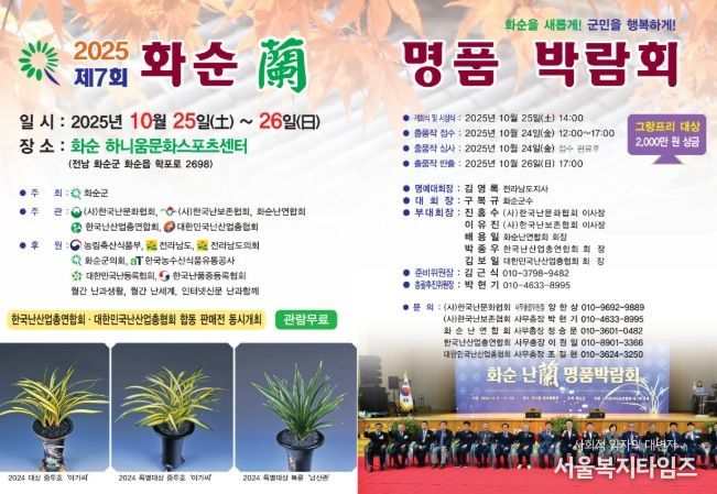 서울복지타임즈 이재연 기자 | 대한민국 난(蘭) 산업의 중심지로 자리매김하고 있는 전남 화순군이 ‘제7회 2025 화순 난 명품 박람회’를 오는 10월 25일부터 26일까지 이틀간 화순 하니움문화스포츠센터 실내체육관에서 개최한다.