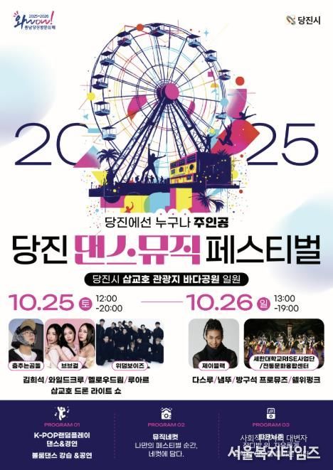 서울복지타임즈 이재연 기자 | 당진시가 오는 25일과 26일 이틀간 삽교호 관광지 바다공원 일원에서‘2025년 당진 댄스·뮤직 페스티벌(DDMF)’을 개최하며, '춤과 음악으로 하나 되는 당진, 당진에선 누구나 주인공'이라는 주제로 화려한 가을 축제의 장을 펼친다.
