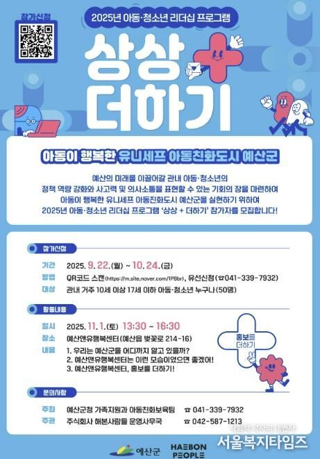 서울복지타임즈 이재연 기자 | 예산군은 아동·청소년이 주체가 돼 아동친화도시 조성에 참여하는 ‘상상+더하기 아동·청소년 리더십 프로그램’의 참가자 모집기간을 기존 10월 17일에서 24일까지로 연장했다고 밝혔다.