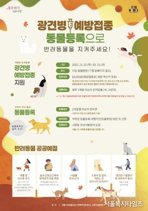 서울복지타임즈 이재연 기자 | 마포구는 10월 31일까지 광견병 발생 및 확산을 예방하기 위해 관내 40곳 동물병원에서 ‘2025년 가을철 광견병 예방접종’을 실시한다.