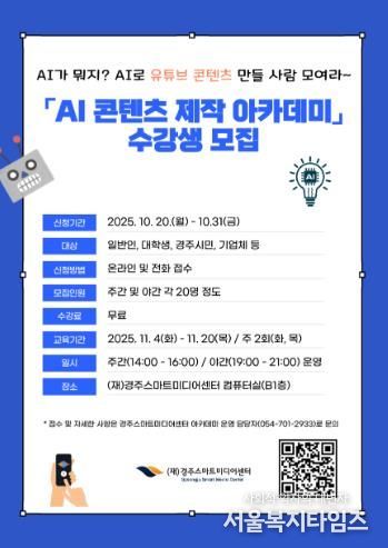 서울복지타임즈 이재연 기자 | (재)경주스마트미디어센터는 오는 11월 ‘AI 콘텐츠 제작 아카데미’를 개설하고 참가자를 모집한다고 21일 밝혔다.