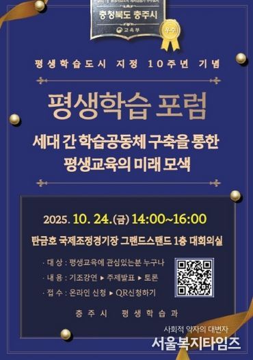 서울복지타임즈 이재연 기자 | 충주시가 평생학습도시 지정 10주년을 맞아 평생학습 포럼을 24일 오후 2시, 탄금호국제조정경기장 그랜드스탠드 대회의실에서 개최한다.