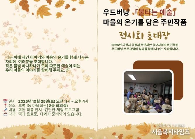 서울복지타임즈 이재연 기자 | 의왕시는 마을공동체 자강불식이 오는 10월 25일 초평1동마을회관(윗새우대북길 14)에서'우드버닝, 불타는 예술'작품전시회를 개최한다고 밝혔다.