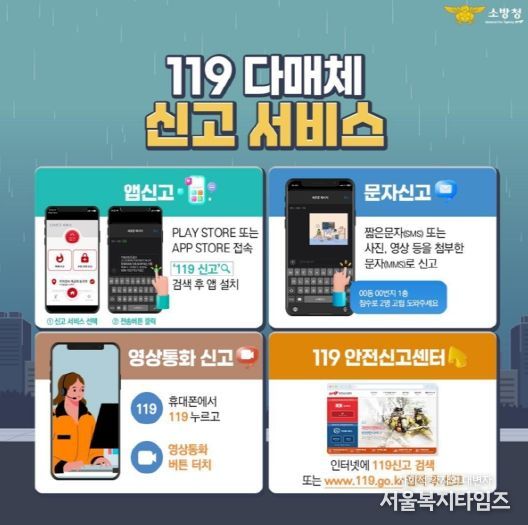 ‘119 다매체 신고 서비스’는 기존 음성통화 외에도 ▲스마트폰 앱 ▲문자(SMS·MMS) ▲영상통화 ▲119안전신고센터 홈페이지 등 다양한 경로를 통해 신고가 가능한 시스템이다.