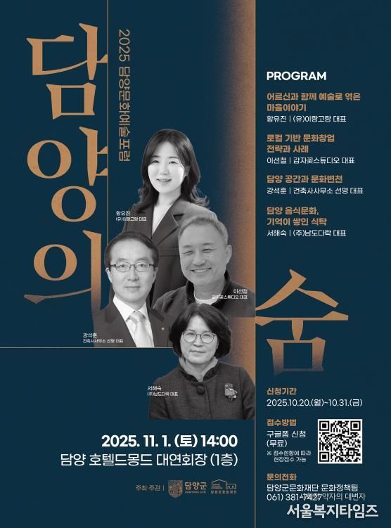 서울복지타임즈 이재연 기자 | 담양군문화재단은 11월 1일 토요일 오후 2시, 담양 호텔드몽드 대연회장에서 2025 담양 문화예술포럼 '담양의 숨'을 개최한다고 밝혔다.