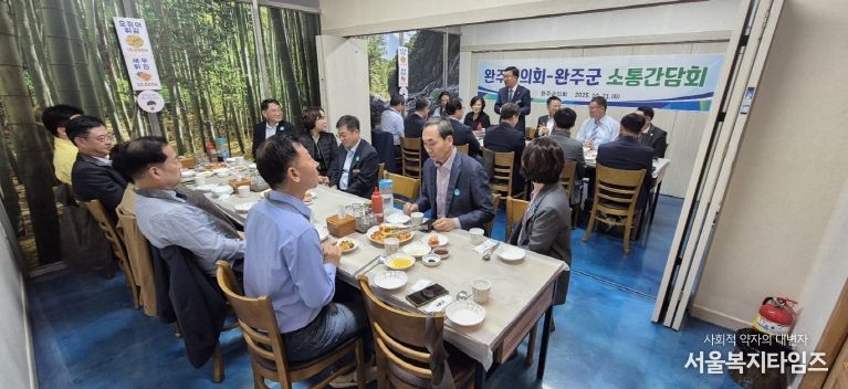 서울복지타임즈 이재연 기자 | 완주군의회는 21일 삼례읍 수계리의 한 식당에서 유희태 군수를 비롯한 간부 공직자들과 함께 소통 간담회를 열고, 남은 후반기 임기 동안 의회와 집행부 간 협력 강화와 완주군 발전 방향을 모색했다.