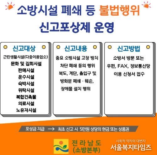 서울복지타임즈 이재연 기자 | 나주소방서는 소방시설에 대한 불법행위를 근절하고 자율적인 안전문화를 정착시키기 위해 연중 ‘불법행위 신고포상제’를 운영하고 있다고 21일 밝혔다.
