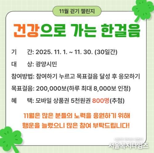 서울복지타임즈 이재연 기자 | 광양시는 지역 주민의 건강생활 실천을 돕기 위해 11월 1일부터 30일까지 모바일 걷기 앱 '워크온'에서 ‘건강으로 가는 한걸음 11월 걷기 챌린지’를 운영한다고 밝혔다.