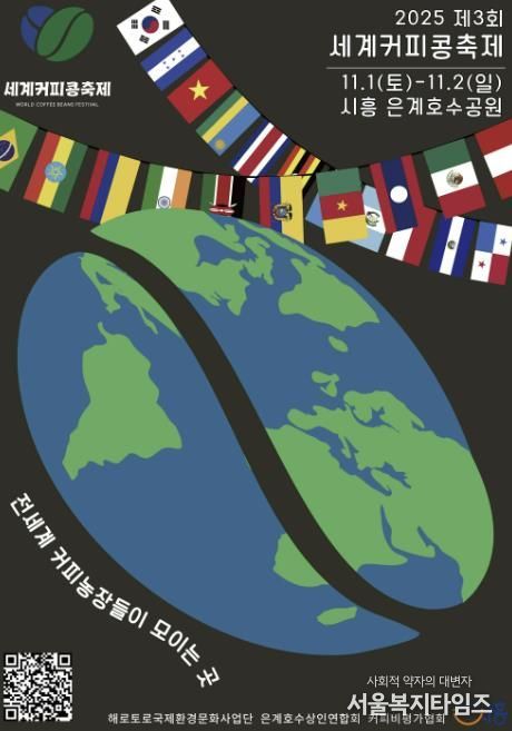서울복지타임즈 이재연 기자 | ‘제3회 세계커피콩축제’가 오는 11월 1일부터 2일까지 양일간 시흥시 은계호수공원에서 개최된다. 이번 축제는 커피비평가협회와 세계커피콩축제위원회가 운영하며, 해로토로국제환경문화사업단이 주최ㆍ주관하고 시흥시가 후원한다.