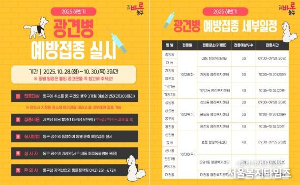서울복지타임즈 이재연 기자 | 대전 동구는 광견병 발생을 예방하고 반려동물로 인한 인수공통전염병 확산을 방지하기 위해, 오는 28일부터 30일까지 사흘간 2025년 하반기 광견병 예방접종을 실시한다고 22일 밝혔다.