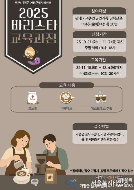 서울복지타임즈 이재연 기자 | 가평군은 군인가족, 경력단절여성, 다문화여성 등 취업취약계층 여성을 대상으로 ‘바리스타 2급 자격증 취득과정’을 운영하며, 총 20명의 교육생을 모집한다.