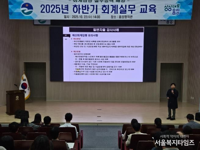서울복지타임즈 이재연 기자 | 음성군은 22일 음성명작관에서 회계 담당 군 공직자 130여 명을 대상으로 ‘2025년 하반기 회계실무 교육’을 실시했다.