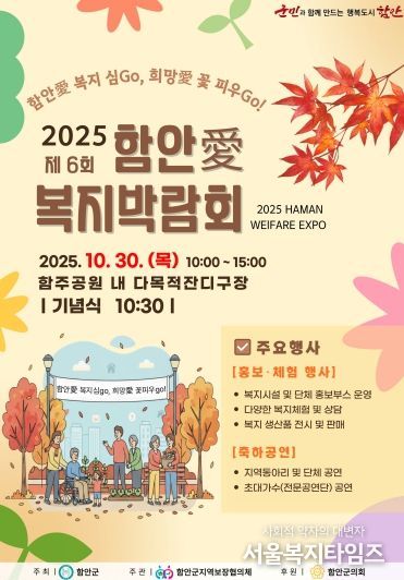 서울복지타임즈 이재연 기자 | 함안군과 함안군지역사회보장협의체는 오는 30일 오전 10시 함주공원 다목적잔디구장에서 ‘제6회 함안애(愛) 복지박람회’를 개최한다고 밝혔다.