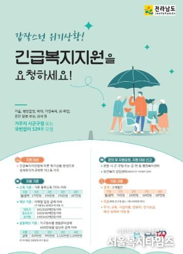 정광선 전남도 보건복지국장은 “갑작스러운 위기상황에 놓이면 주저하지 말고 가까운 읍면동 주민센터나 129 또는 120, 복지위기알림앱 등으로 도움을 요청하길 바란다”며 “전남도와 민관이 함께 위기가정을 조기에 발굴하고 필요한 지원이 누락되지 않도록 사회복지 행정을 펼치겠다”고 말했다.