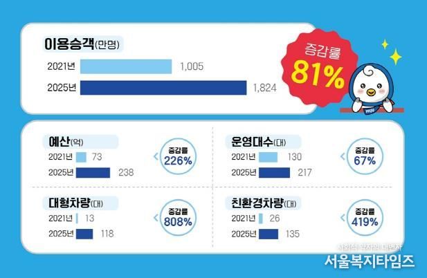 이러한 지원 확대에 힘입어 마을버스 이용 승객은 2021년 1,005만 명에서 2025년 1,824만 명으로 늘며 81% 증가한 것으로 나타났다.