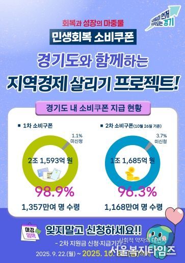 서울복지타임즈 이재연 기자 | 경기도가 민생회복 소비쿠폰 2차 지급 신청이 오는 31일 오후 6시 마감된다며 기한 내 신청을 당부했다. 기한이 지난 미신청 금액은 자동 소멸된다.