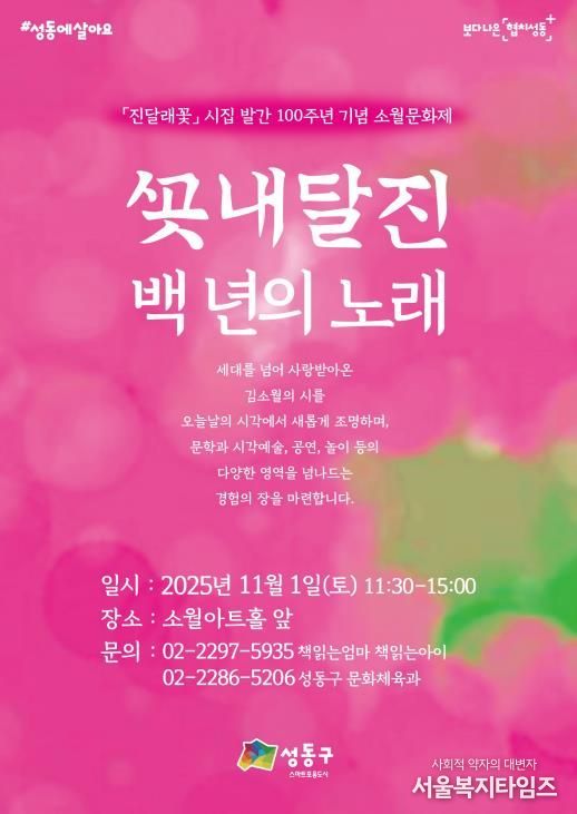 서울복지타임즈 이재연 기자 | 서울 성동구는 김소월 시집 ‘진달래꽃’ 출간 100주년을 기념해 오는 11월 1일 ‘진달래꽃, 백년의 노래’를 주제로 ‘2025 소월문화제’를 개최한다고 밝혔다.