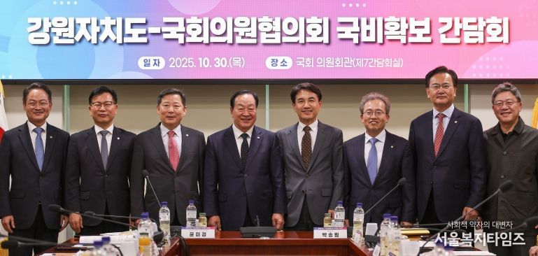 서울복지타임즈 이재연 기자 | 김진태 강원특별자치도지사는 10월 30일 오후 2시, 국회 의원회관에서 도내 지역구 국회의원 7명과 함께 도 국회의원협의회를 열고 2026년도 국비 추가 확보 방안 등을 논의했다.