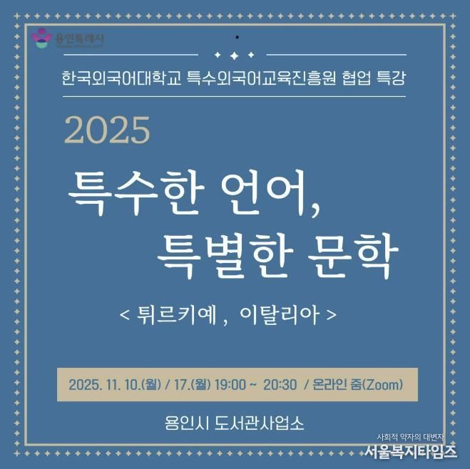 서울복지타임즈 이재연 기자 | 용인특례시는 11월 10일과 17일 온라인 줌을 통해 시민을 위한 온라인 인문학 강연 ‘특수한 언어, 특별한 문학’을 운영한다고 3일 밝혔다.