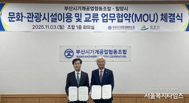 서울복지타임즈 이재연 기자 | 경남 밀양시와 부산시기계공업협동조합은 3일 부산 강서구에 위치한 부산시기계공업협동조합 회의실에서 문화·관광시설 이용 및 교류 업무 협약을 체결했다고 밝혔다.