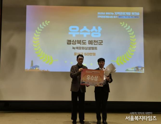 서울복지타임즈 이재연 기자 | 예천군은 ‘2025년 찾아가는 지역관광개발 워크숍’에서 ‘녹색문화 상생벨트(삼강문화단지 조성사업)’이 지역관광개발사업 우수상을 수상했다고 밝혔다.