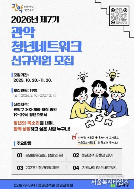 서울복지타임즈 이재연 기자 | 청년친화도시 관악구가 청년들이 직접 청년을 위한 정책을 발굴하고 제안하는 '제7기 관악청년네트워크' 위원 19명을 신규 모집한다.