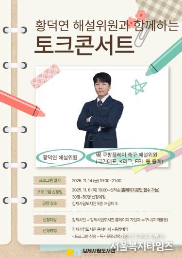 서울복지타임즈 이재연 기자 | 김제시립도서관은 오는 14일 금요일 19시부터 도서관 5층 배움터 3에서 ‘황덕연 해설위원과 함께하는 토크콘서트 내 꿈을 읽는 도서관’을 진행한다고 밝혔다