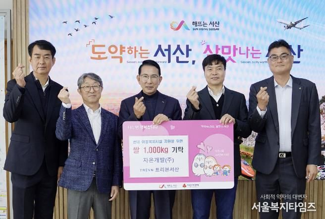 서울복지타임즈 이재연 기자 | 충남 서산시는 5일 시청 시장실에서 자온개발㈜·트리븐 서산의 이웃돕기 쌀 기탁식을 개최했다고 밝혔다.
