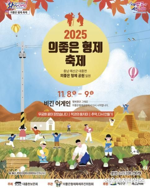 서울복지타임즈 이재연 기자 | 예산군 대표 가을축제인 ‘2025 의좋은형제축제’가 오는 11월 8일부터 9일까지 이틀간 대흥면 의좋은형제공원 일원에서 열린다.