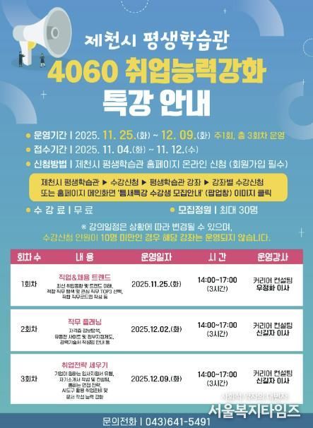 이번 틈새특강은 일반시민과 40대 이상 취업·재취업 준비자, 평생학습강사를 대상으로 진행되며, 세명대학교와 대원대학교 교수진 및 컨설팅 전문가들이 참여한다.