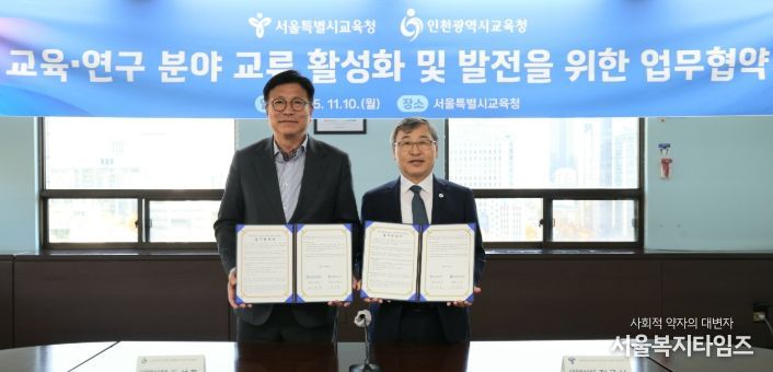 서울복지타임즈 이재연 기자 | 인천광역시교육청은 10일 서울특별시교육청과 함께 읽걷쓰 교육과 심층 쟁점 독서토론 기반의 교육 혁신 및 교육·연구 교류 활성화를 위한 업무협약을 체결했다.
