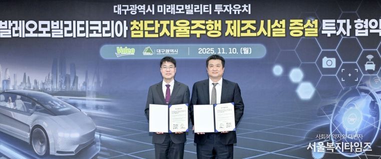 서울복지타임즈 이재연 기자 | 대구광역시는 11월 10일 시청 동인청사에서 발레오모빌리티코리아㈜(대표 김민규)와 첨단 자율주행 센서의 대량 양산체계 구축을 위한 공장 증설 투자협약을 체결했다.