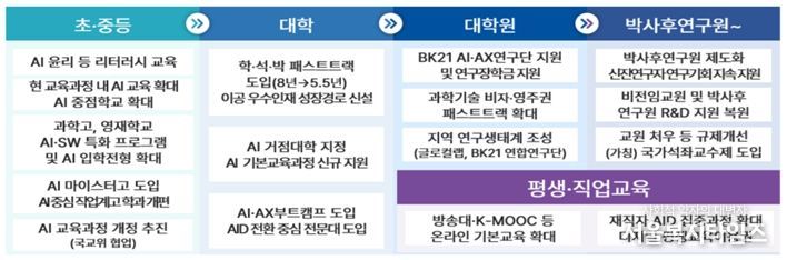 이공 우수인재 성장경로 지원사업을 신설하여, 우수한 학부생들이 교수들의 밀착 지원을 받으며 조기에 연구 프로젝트 등에 참여하고 걱정 없이 학업에 몰두할 수 있도록 연간 2,000만 원 수준의 학업 장려금을 지원한다. 2026년부터 400명을 선정할 계획이며, 향후 우수 학부생이 박사후 단계까지 안정적으로 성장할 수 있도록 지원 범위를 늘려나갈 예정이다. 두뇌한국(BK) 21 사업 인공지능(AI) 교육연구단도 확대하여 인공지능(AI) 석‧박사 인재를 양성한다.