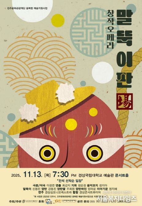 서울복지타임즈 이재연 기자 | 경상국립대학교 음악교육과 최강지 교수가 이끄는 경상오페라단은 진주의 대표 민속예술 ‘진주 오광대’를 모티브로 한 창작오페라 '말뚝이판場'(작사·작곡 이정연)을 11월 13일 오후 7시 30분 경상국립대학교 음악교육과 콘서트홀에서 초연한다.